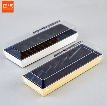The Trapezoidal-lined Box, with a design that is wider at the top and narrower at the bottom, is the best choice for packaging sushi and pastries. The design with an inner tray is key to maintaining food stability and preventing stacking, and it is equipped with a transparent pet lid and a black fork. The food can be directly viewed through the transparent lid, and there are boxes and cardholders of different colors to choose from.